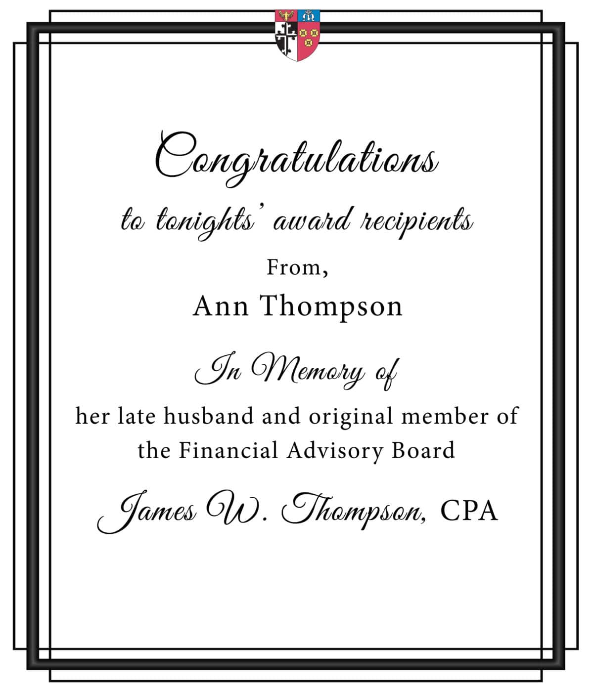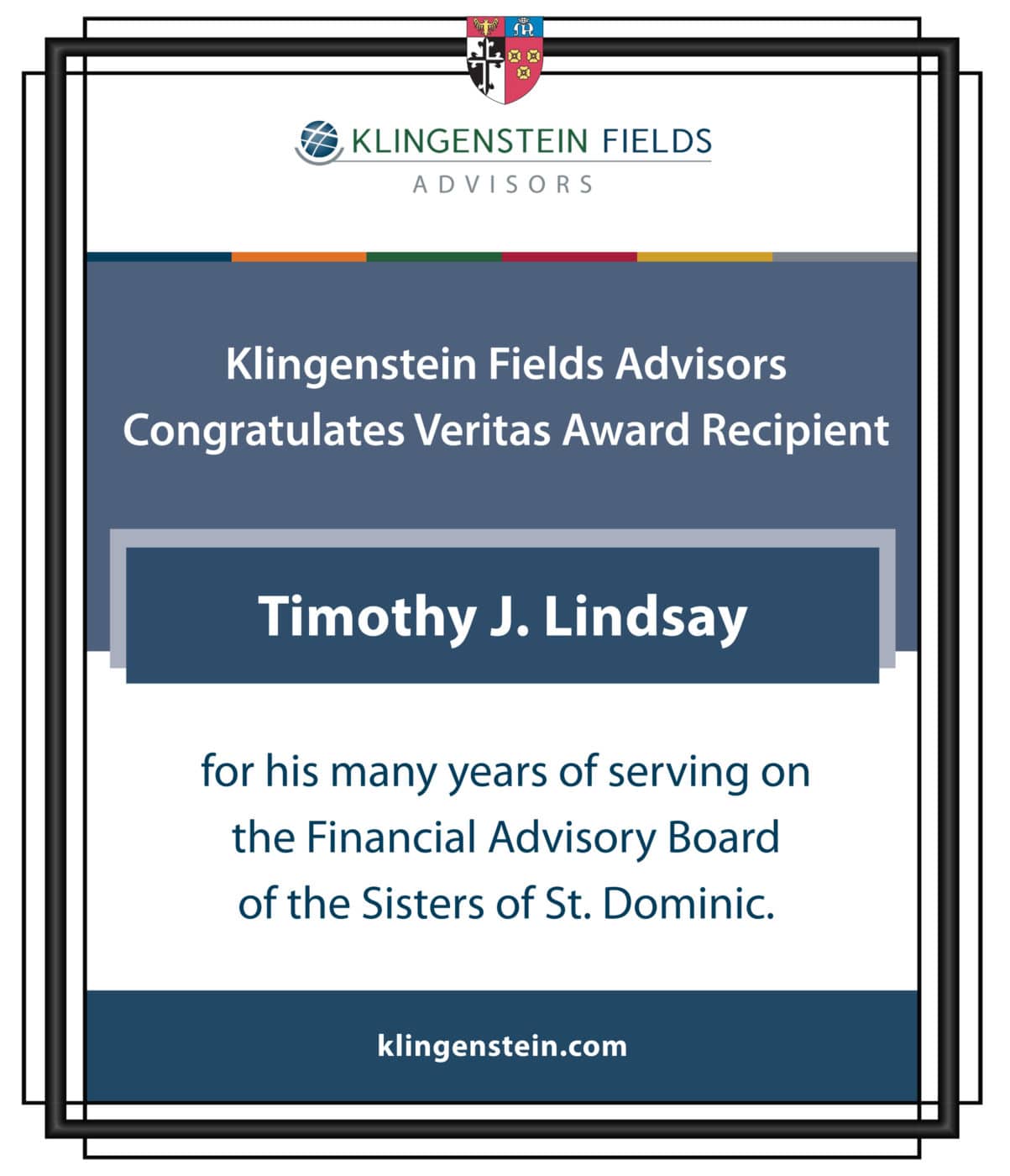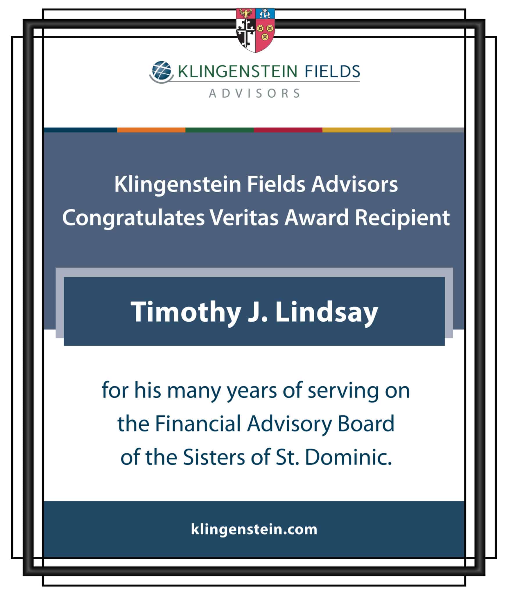 The Veritas Award is presented annually by the Congregation to those who personify service and dedication to humankind. The professionals who serve on the Congregational Financial Advisory Board exemplify gifts born of education and used towards a higher purpose.