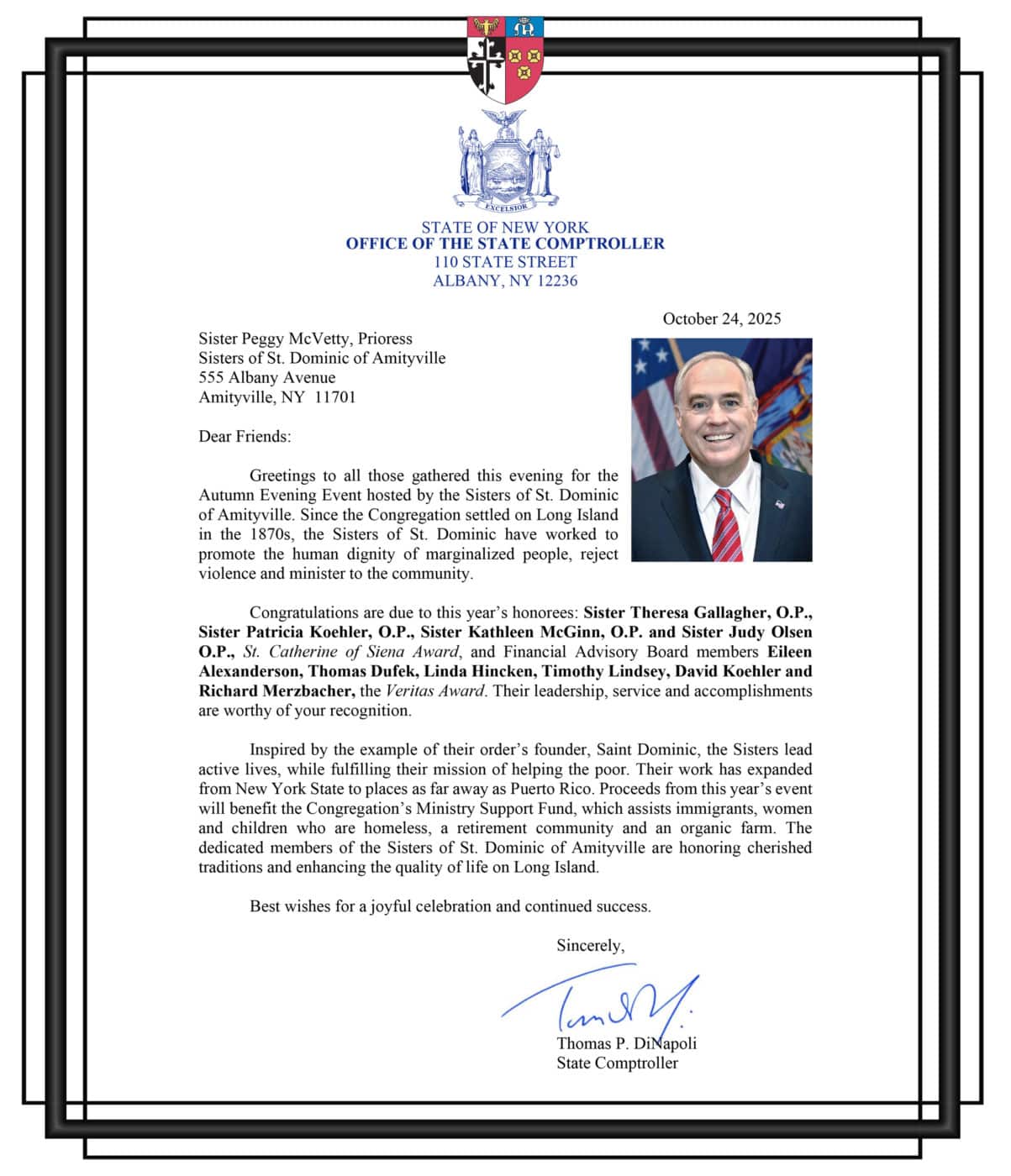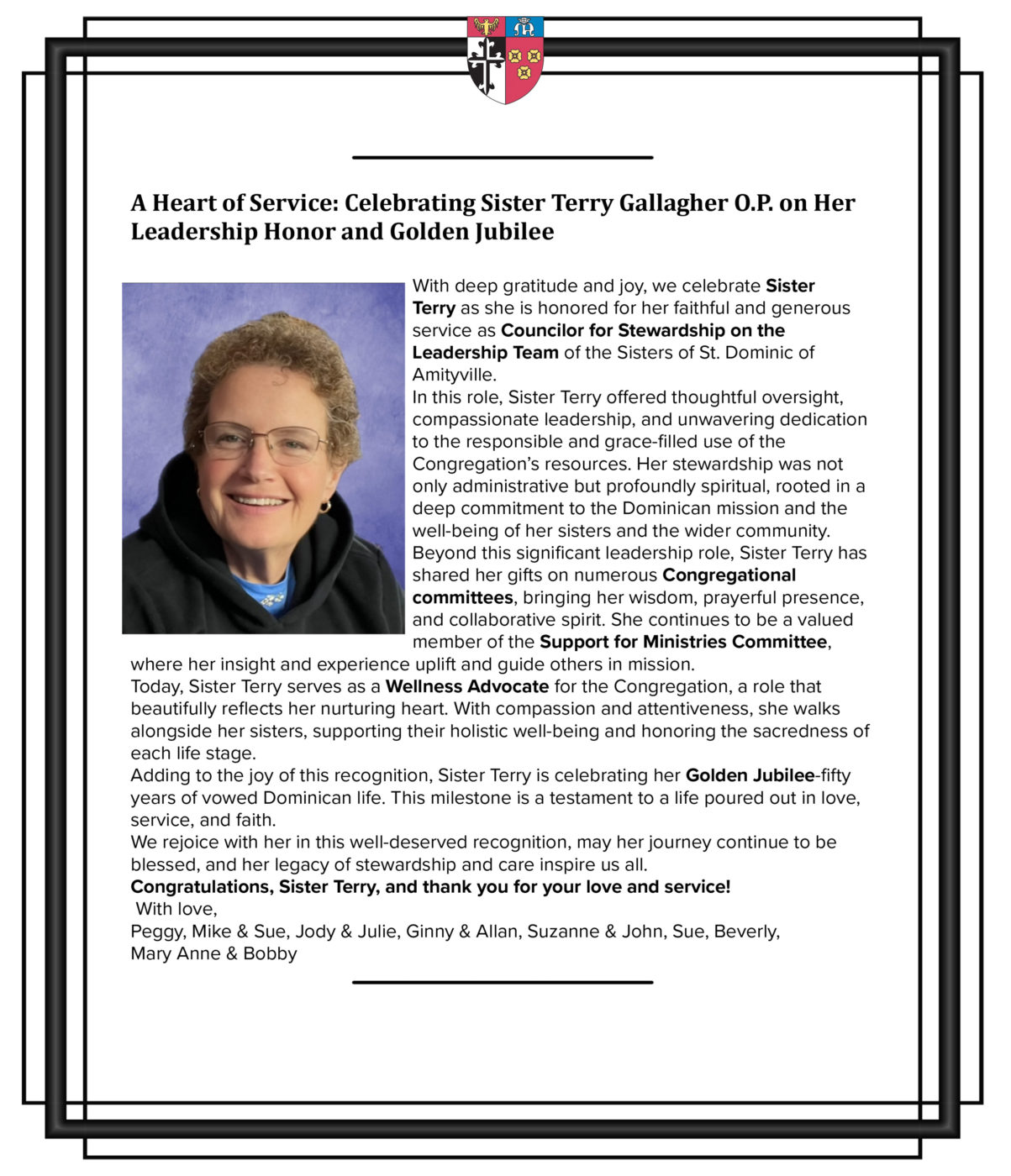 This year, we are honoring the Amityville Dominican Sisters who have served as Treasurer for the Congregation. As good stewards of the Congregation’s financial resources, their accomplishments go beyond basic financial management and involve taking a proactive approach to ensuring the long-term financial health of the Sisters and our mission.