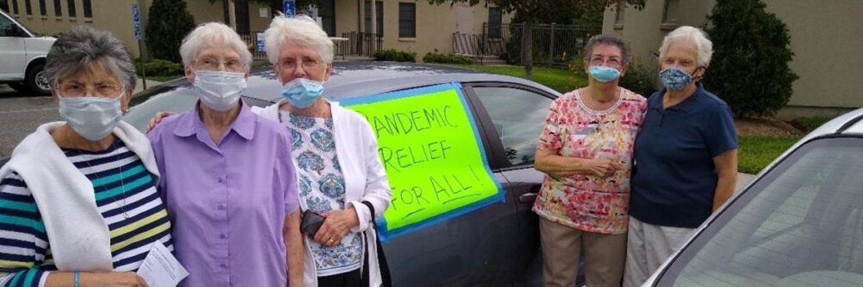 Sisters Carolann Masone, Margaret Rose Smyth, Mary Pat Neylon, Laura Helbig, and Emily Masse represented our Congregation in The Car Caravan on August 19th, an effort to advocate for the undocumented and alert our State Senators to pass legislation to ensure excluded workers get the relief they need to survive the Corona crisis.